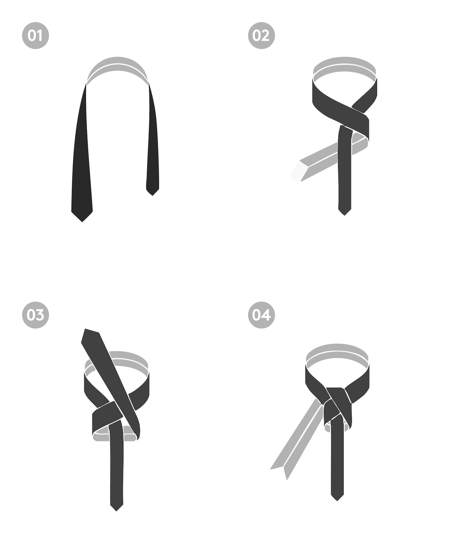 01: Start with the wide end of the tie on your right, extending about 12 inches lower than the narrow end.